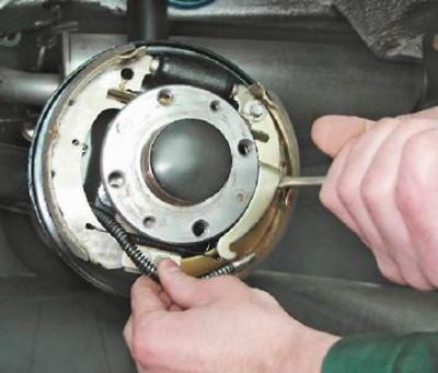 8. У тормозного механизма левого заднего колеса большой шлицевой отверткой сдвигаем распорный рычаг вперед и снимаем серьгу троса с крючка распорного рычага.