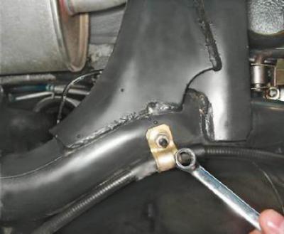 9. Накидным ключом на 10 мм отворачиваем гайку кронштейна крепления троса к левому рычагу задней подвески.