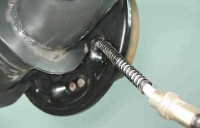 13. Выводим трос из отверстия опорного щита заднего тормозного механизма и снимаем его.