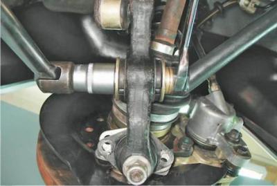 12. При необходимости зажимаем рычаг в тисках и выпрессовываем из него палец шаровой опоры (см. "Шаровая опора стойки - снятие и установка").