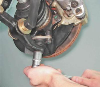 4. Торцовым ключом на 17 мм отворачиваем два болта крепления шаровой опоры к поворотному кулаку.