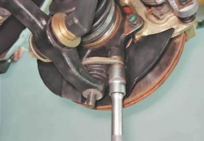 6. Заворачивая болт съемника, выпрессовываем палец шаровой опоры из отверстия рычага и снимаем шаровую опору.