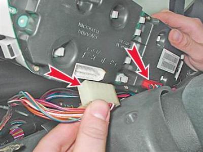 5. Вынимаем щиток из проема панели приборов и отсоединяем две колодки жгутов проводов.