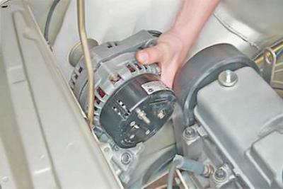 Замечание: Отворачивать болты нижнего крепления генератора удобнее на смотровой яме или эстакаде, сняв правую часть брызговика двигателя. При необходимости эту работу можно выполнить сверху из моторного отсека.