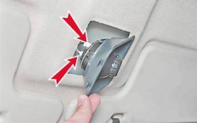 2. Поддев шлицевой отверткой, вынимаем фонарь из проема обивки потолка. Отсоединяем колодки двух проводов от выводов фонаря.