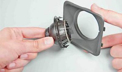 4. Отжимаем пружинные фиксаторы патрона лампы и вынимаем патрон вместе с лампой из фонаря.