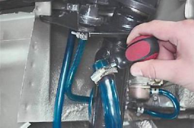 5. Крестовой отверткой ослабляем затяжку хомута шланга заливной горловины.