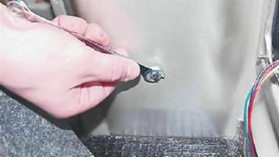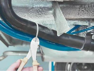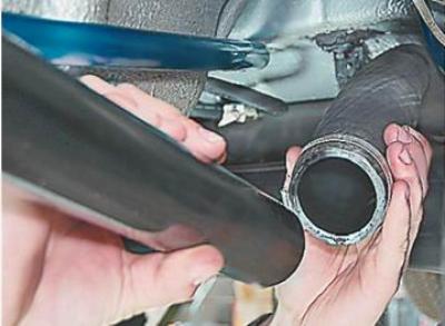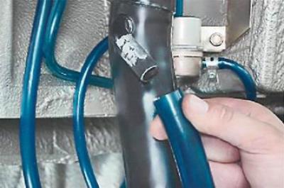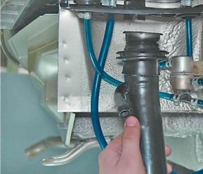 6. Ключом на 10 мм отворачиваем две гайки крепления заливной трубы к кузову и разрезаем хомут крепления пластмассовой трубки к заливной трубе.