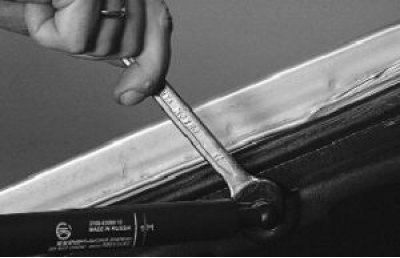1. Придерживая дверь задка, выверните шаровой палец крепления левого упора к двери задка и подставьте под дверь деревянный брусок соответствующего размера.