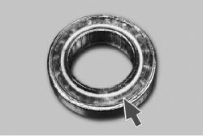 20. Запрессуйте задний подшипник до упора в бурт трубы с помощью подходящей оправки, прикладывая усилие только к наружному кольцу подшипника. Подшипник установлен на пластмассовой втулке, у которой с одной стороны расположен широкий фланец. При установке подшипника именно широкий фланец втулки должен быть направлен наружу.
