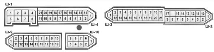 Условная нумерация штекеров в колодках монтажного блока для подключения проводов в салоне: Ш-1–Ш-4 и Ш-3–Ш-2 – колодки, соединяющиеся со жгутом проводов панели приборов; Ш-9 и Ш-10 – колодки, соединяющиеся с задним жгутом проводов