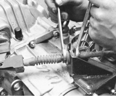 2. Если автомобиль начинает движение в конце хода педали сцепления, необходимо отрегулировать полный ход педали. Сцепление переднеприводных автомобилей ВАЗ приводится в действие тросом, соединенным с педалью сцепления. Для регулировки такого сцепления достаточно открыть капот. На резьбовой части троса есть две гайки, которыми трос крепится к кронштейну. Этими гайками можно отрегулировать ход педали сцепления.