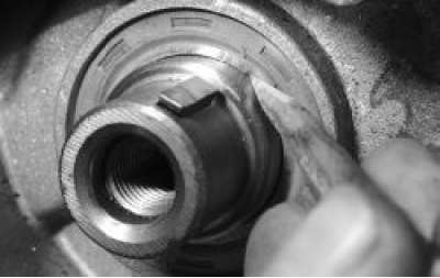 15. Смажьте рабочую кромку сальника моторным маслом. При установке насоса аккуратно заправьте рабочую кромку сальника на шейку коленчатого вала с помощью деревянной палочки и вверните болты крепления насоса.