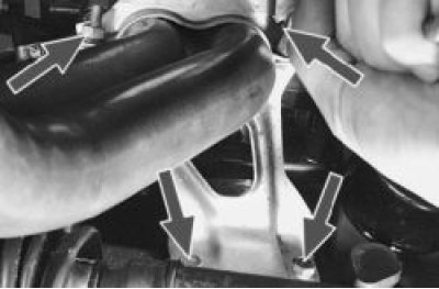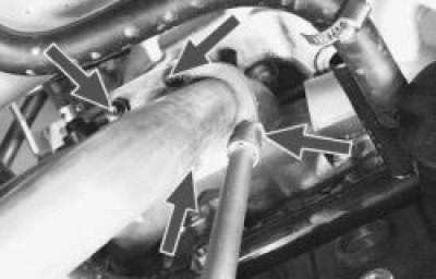 4. Отверните четыре гайки крепления приемной трубы к выпускному коллектору.
