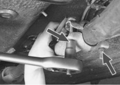 2. Отверните две гайки крепления приемной трубы к кронштейну под днищем автомобиля. Затем выверните два болта крепления кронштейна к кузову и снимите кронштейн.