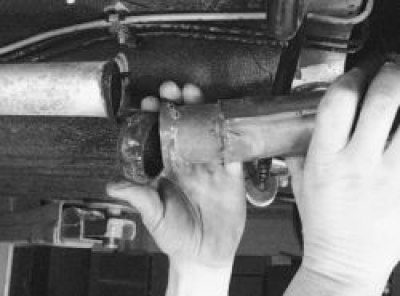 6. Разъедините приемную трубу глушителя и трубу резонатора, вынув уплотнительное кольцо. Поврежденное кольцо замените. Снимите приемную трубу.