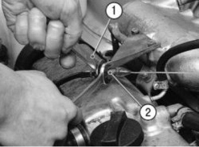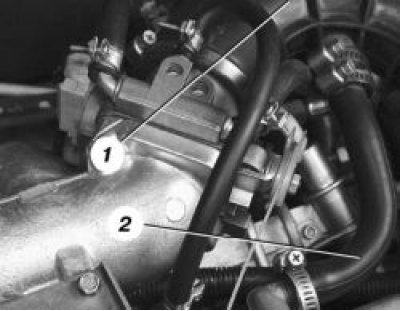 1. Отсоедините воздухоподводящий патрубок 1 от корпуса дросселя и шланг 2 большой ветви вентиляции картера от штуцера на крышке головки блока, ослабив затяжку хомутов их крепления, и отведите патрубок в сторону вместе со шлангом.