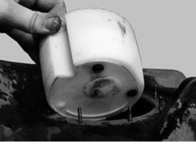 15. Для замены или очистки топливного фильтра подденьте его основание заостренным инструментом и снимите с корпуса насоса. Извлеките стопорную шайбу.