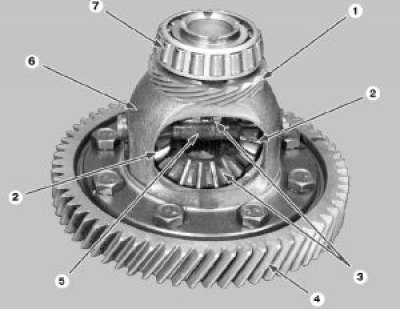 Дифференциал: 1 – ведущая шестерня привода спидометра; 2 – сателлит; 3 – полуосевая шестерня; 4 – ведомая шестерня главной передачи; 5 – ось сателлитов; 6 – корпус дифференциала; 7 – подшипник дифференциала