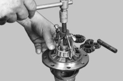 7. Осмотрите рабочие поверхности сателлитов, оси сателлитов, полуосевых шестерен и соприкасающиеся с ними сферические поверхности корпуса дифференциала. Мелкие неровности устраните мелкозернистой шкуркой. Детали со значительными дефектами замените.