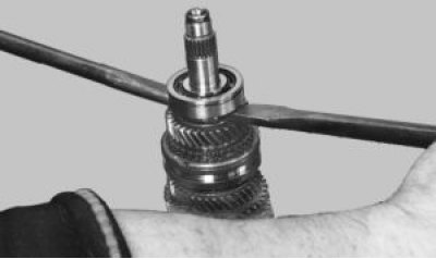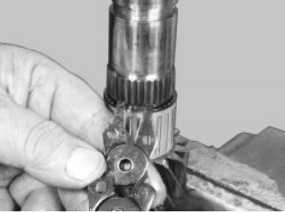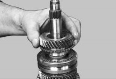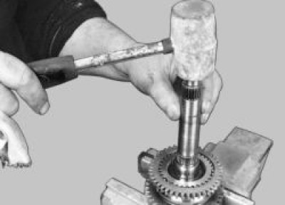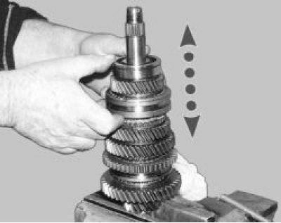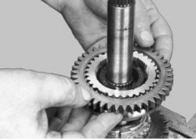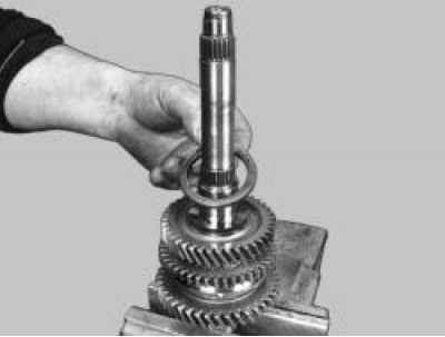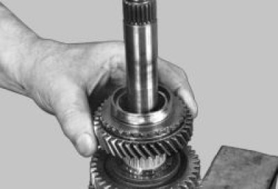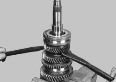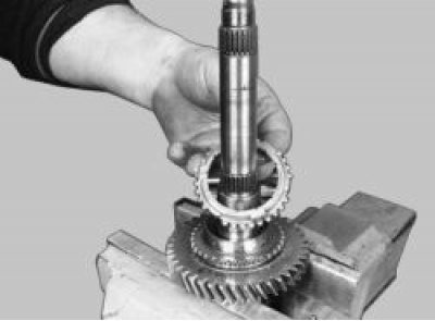 20. Установите вал шестерни I передачи на губки тисков и ударами деревянной киянки по торцу вала спрессуйте синхронизатор I и II передач со шлицев вала.