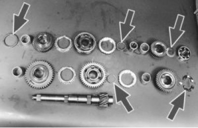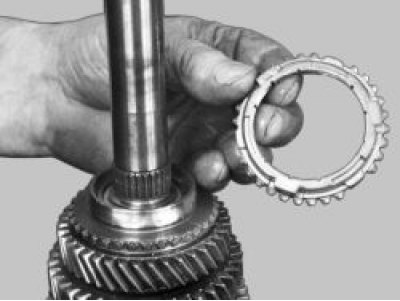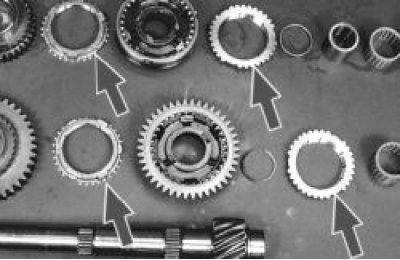 32. Проверьте состояние блокирующих колец синхронизаторов. При наличии забоин и сколов на зубчатых венцах или значительной выработки на конусах замените блокирующие кольца.