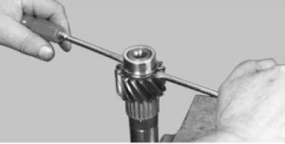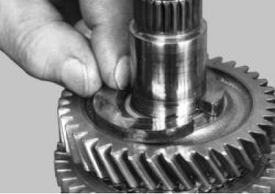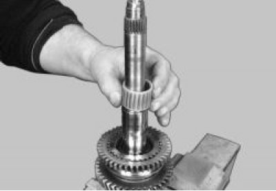 Предупреждение! Вторичный вал нужно зажимать в тисках c мягкими накладками на губках за внутреннее кольцо переднего подшипника. Затягивайте тиски так, чтобы вал можно было наклонять усилием руки, иначе можно повредить поверхность беговой дорожки подшипника.
