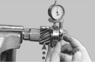 31. Радиальный зазор шариковых и роликовых подшипников не должен превышать 0,05 мм. Это можно проверить индикатором. Установите подшипник на вал, а ножку индикатора на верхнюю точку наружного кольца подшипника. Слегка нажмите на подшипник снизу вверх. Разница показаний индикатора между исходным положением и при нажатии на подшипник и будет радиальным зазором.