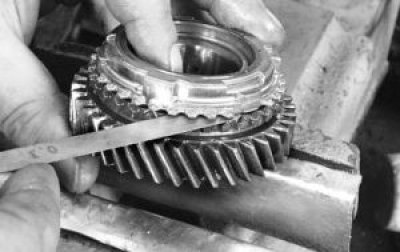 33. Проверьте зазор между шестернями и соответствующими им блокирующими кольцами. Минимально допустимый зазор составляет 0,6 мм. Если он меньше, блокирующее кольцо нужно заменить.