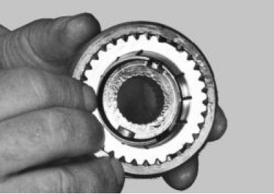 35. Соберите вторичный вал в порядке, обратном разборке. Старые блокирующие кольца установите в соответствии с ранее сделанными метками. Новые кольца установите так, чтобы малые выступы на кольце (отсутствуют зубья) совпали с пазами ступицы синхронизатора, где установлены фиксаторы.
