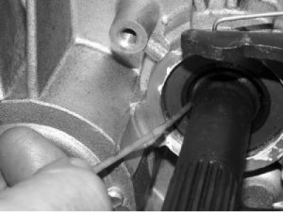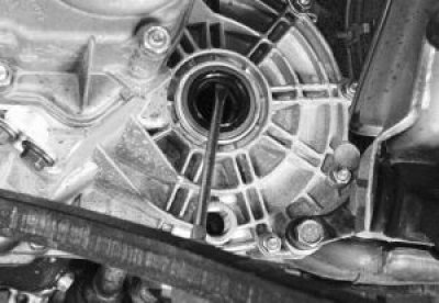 2. Извлеките из картера коробки передач сальник внутреннего шарнира с помощью отвертки.
