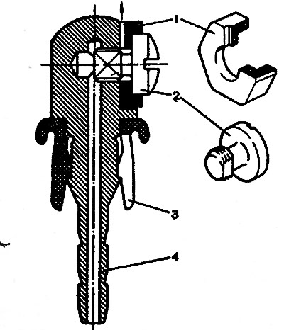 Рис. 8-27. Жиклер омывателя ветрового стекла: 1 - распылитель; 2 - винт; 3 - втулка; 4 - корпус жиклера со штуцером