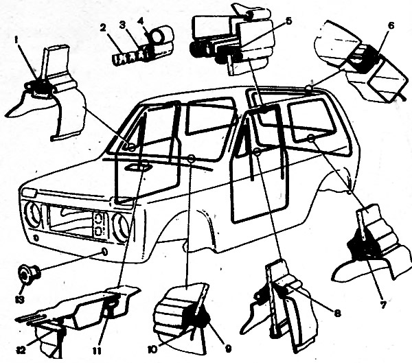 Рис. 8-9. Резиновые уплотнители: 1 - поворотного стекла; 2 - каркас уплотнителя передней двери; 3 - кант уплотнителя; 4 - уплотнитель проема передней двери, 5 - опускного стекла; 6 - проема двери задка; 7 - стекла боковины; 8 - нижний уплотнитель опускного стекла; 9 - ветрового стекла, 10 - сливная трубка; 11 - уплотнитель капота: 12 - коробки воздухопритока; 13 - соединителя переднего бампера