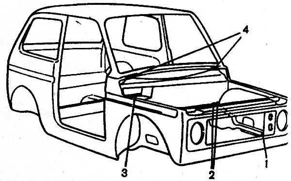 Рис. 8-10. Места нанесения уплотнительной мастики 51-Г-7 (вид кузова спереди): 1 - соединение переднего лонжерона с рамкой радиатора; 2 - стыки переднего лонжерона со щитком передка; 3 - соединение поддона аккумуляторной батареи со щитком передка (со стороны салона), 4 - стыки соединения щитка передка с накладкой передка (из подкапотного пространства)