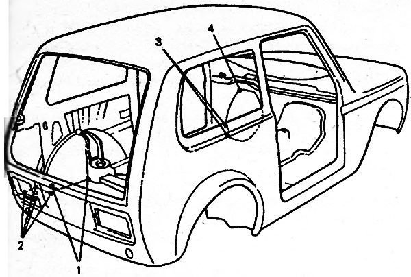Рис. 8-11. Места нанесения уплотнительной мастики 51-Г-7 (вид кузова сзади): 1 - стыки заднего пола с аркой заднего колеса; 2 - щели в угловых стыках надставок заднего пола с арками задних колес, с боковинами и панелью задка; 3 - угловые стыки щитка передка с порогом пола; 4 - угол щитка передка с панелью передней стойки боковины
