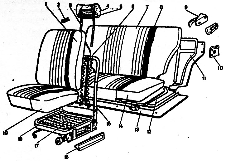 Рис. 8-30. Сиденья: 1 - набивка спинки переднего сиденья; 2 - фиксатор подголовника; 3 - каркас подголовника; 4 - набивка подголовника; 5 - планка каркаса подголовника 6 - направляющая трубка; 7 - обивка сиденья; 8 - подложка обивки сиденья; 9 - фиксатор спинки; 10 - скоба спинки заднего сиденья; 11 - основание спинки сиденья; 12 - основание подушки сиденья; 13 - коврик; 14 - набивка подушки заднего сиденья; 15 - рамка спинки; 16 - облицовка переднего сиденья; 17 - пружина подушки сиденья; 18 - каркас переднего сиденья; 19 - набивка подушки переднего сиденья