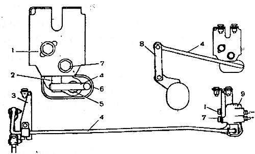 Удерживая регулятор в этом положении, затяните до отказа болты 1 и 7, затем покройте тонким слоем смазки ДТ-1 ось 5 и выступающую часть поршня 2. Заложите 5-6 г этой же смазки в резиновый колпачок 6 и установите его на место.