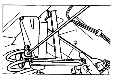 Рис. 6-7. Установка приспособления 67.7820.9519 для регулировки положения регулятора давления задних тормозов: 1 - приспособление 67.7820.9519; 2 - рычаг привода регулятора давления