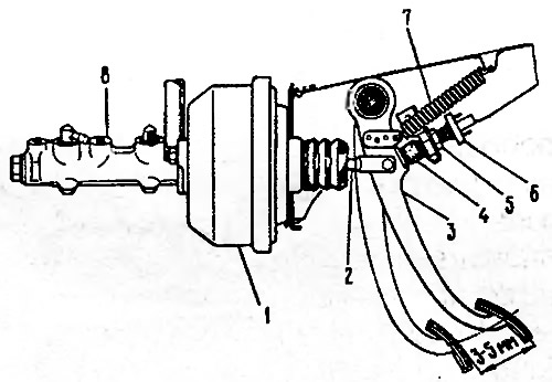 Рис. 6-3. Педаль тормоза: 1 - вакуумный усилитель; 2 -толкатель; 3 - педаль тормоза; 4 - буфер выключателя стоп-сигнала;. 5 - гайка выключателя; 6 - выключатель стоп-сигнала; 7 - оттяжная пружина педали; 8 - главный цилиндр