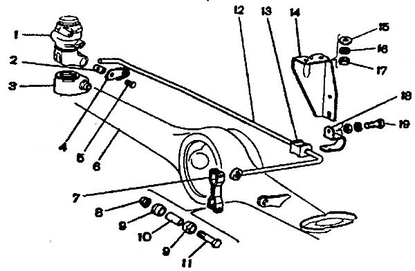 Рис. 6-22. Детали привода регулятора давления: 1 - регулятор давления; 2 - ось рычага привода регулятора; 3 - грязезащитный колпачок; 4 - стопорная пластина; 5 - болт с пружинной шайбой; 6 - балка заднего моста; 7 - тяга соединения рычага привода регулятора давления с кронштейном заднего моста; 8 - гайка болта 11; 9 - пластмассовая втулка; 10 - распорная втулка; 11 - болт крепления тяги; 12 - рычаг привода регулятора давления; 13 - опорная втулка рычага привода; 14 - кронштейн опорной втулки; 15 - шайба, 16 - пружинная шайба;. 17 - гайка, 18 - обойма опорной втулки; 19 - болт крепления обоймы к кронштейну