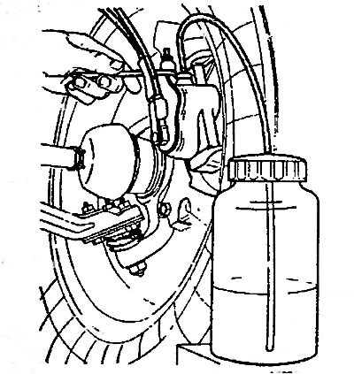 - резко нажимая на педаль тормоза и плавно отпуская ее, завертывайте штуцеры по мере вытекания из них жидкости. Затем прокачайте гидропривод тормозов, как указано выше.