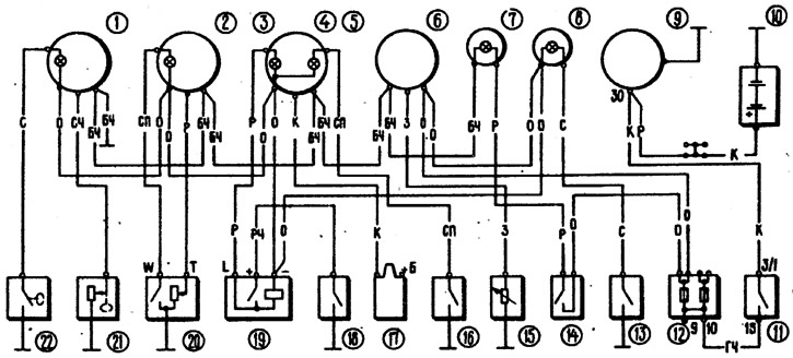 Рис. 7-39. Схема включения приборов: 1 - указатель давления масла с контрольной лампой недостаточного давления; 2 - указатель уровня топлива с контрольной лампой резерва топлива; 3 - контрольная лампа стояночного тормоза; 4 - тахометр; 5 - контрольная лампа воздушной заслонки карбюратора; 6 - указатель температуры охлаждающей жидкости; 7 - контрольная лампа уровня тормозной жидкости; 8 - контрольная лампа блокировки дифференциала; 9 - генератор; 10 - аккумуляторная батарея; 11 - выключатель зажигания; 12 - блок предохранителей; 13 - выключатель контрольной лампы блокировки дифференциала; 14 - датчик недостаточного уровня тормозной жидкости; 15 - датчик указателя температуры охлаждающей жидкости; 16 - выключатель контрольной лампы воздушной заслонки карбюратора; 17 - катушка зажигания; 18 - выключатель контрольной лампы стояночного тормоза; 19 - реле-прерыватель контрольной лампы стояночного тормоза, 20 - датчик указателя уровня и резерва топлива; 21 - датчик указателя давления масла; 22 - датчик контрольной лампы давления масла
