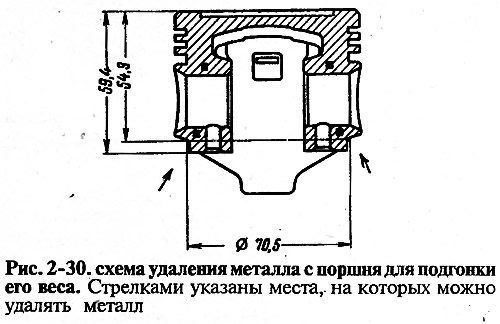 Если нет комплекта поршней одной весовой группы, можно удалить часть металла на основании бобышек под поршневой палец Место съема металла указано стрелками на рис. 2-30. Съем металла, однако, не должен превышать 4,5 мм по глубине относительно номинальной высоты поршня (59,40 мм), а по ширине ограничивается диаметром 70.5 мм.