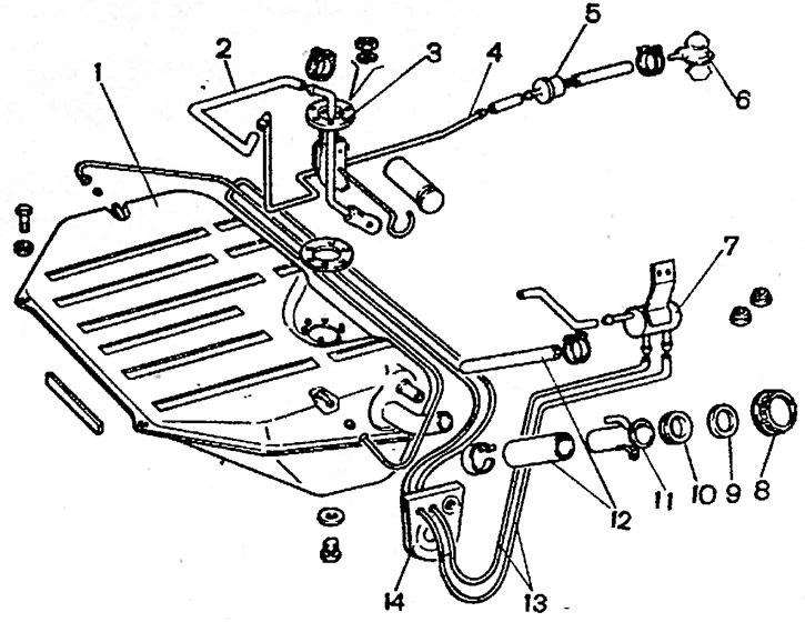 Рис. 2-80. Детали топливного бака и топливопровода: 1 - топливный бак; 2 - шланг; 3 - датчик уровня топлива; 4 - топливопровод; 5 - фильтр тонкой очистки; 6 - топливный насос; 7 - сепаратор, 8 - пробка; 9 - прокладка, 10 - уплотнитель наливной трубы; 11 - наливная труба, 12 - соединительные шланги; 13 - вентиляционные шланги; 14 - уплотнитель