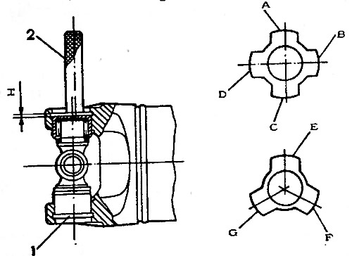 Рис. 3-55. Сборка карданного шарнира: 1 - стопорное кольцо; 2 - калибр; Н - зазор; А, В, С, D, Е, F, G - лепестки калибров, имеющие толщину, мм: 1,45; 1,48; 1,52; 1,56; 1,60; 1,64, 1,67