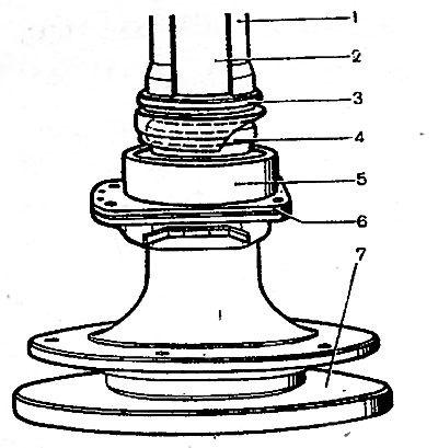 Рис. 3-65. Запрессовка запорного кольца подшипника полуоси: 1 - оправка; 2 - полуось; 3 - обойма; 4 - запорное кольцо; 5 - подшипник; 6 - пластина крепления подшипника и маслоотражатель в сборе; 7 - опорное кольцо