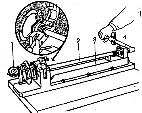 Приставьте ножку индикатора 1 с ценой деления 0,01 мм, к фланцу полуоси. После установки стрелки индикатора на «0» приложите указанную осевую нагрузку, создавая динамометрическим ключом момент затягивания 78,5-83,3 Н·м (8-8,5 кгс·м) на винте приспособления. Винт через шарик упирается в торец полуоси. При этом не должно появляться даже самого минимального зазора между запорным кольцом и внутренним кольцом подшипника.