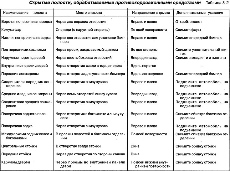 - перегоните автомобиль в камеру нанесения противокоррозионного состава и поставьте на подъемник. Нанесите распылением противокоррозионный состав в места, показанные на рис. 8-6, 8-7 и 8-8;