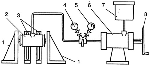 1 - упоры поршней; 2 - испытываемый цилиндр; 3 - кронштейн цилиндра; 4 - манометр низкого давления; 5 - манометр высокого давления; 6 - цилиндр для создания давления; 7 - сосуд; 8 - маховик.