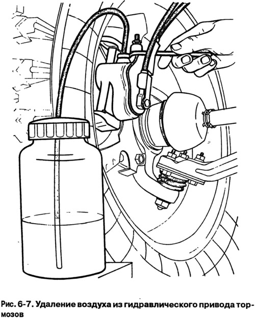 Наденьте на головку штуцера резиновый шланг (рис. 6-7) для слива жидкости, а его свободный конец опустите в прозрачный сосуд, частично заполненный тормозной жидкостью.